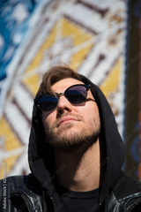 Portrait Headshots of a Young Handsome Attractive Modern Fashion Caucasian Male Guy Modeling near Local Outdoor Art in Urban City in Autumn Winter Season on Bright Sunny Day