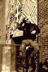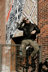 Portrait Headshots of a Young Handsome Attractive Modern Fashion Caucasian Male Guy Modeling near Local Outdoor Art in Urban City in Autumn Winter Season on Bright Sunny Day