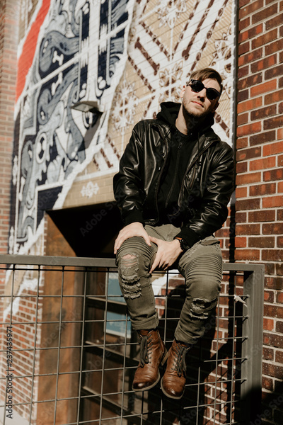Portrait Headshots of a Young Handsome Attractive Modern Fashion Caucasian Male Guy Modeling near Local Outdoor Art in Urban City in Autumn Winter Season on Bright Sunny Day
