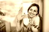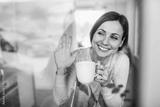 A young woman with cup of coffee looking out of a window, waving goodbye.