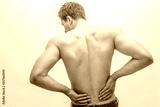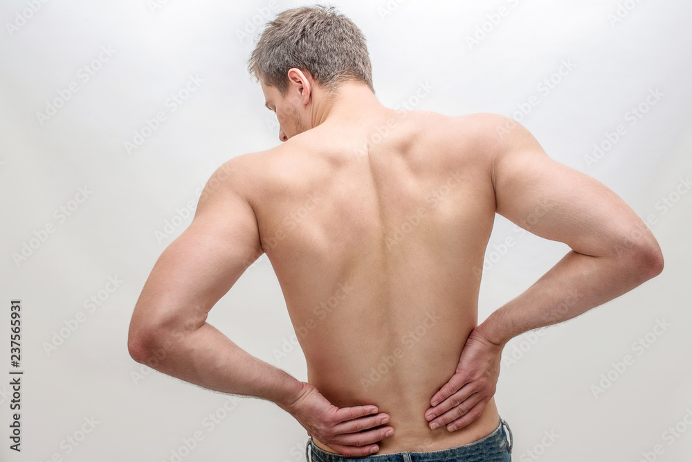 Young man stand and hold hands on back. He feels pain in kidneys area. Isolated on white background.