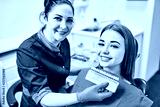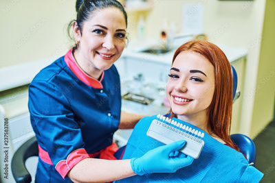 Dentist comparing patient's teeth shade with samples for bleaching treatment