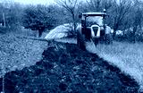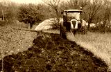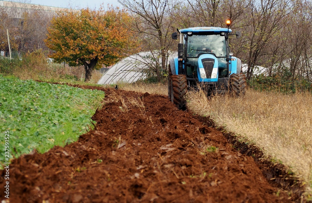 A tractor plows an uncultivated agricultural land for sowing, in the last days of autumn. Alongside there is a green cultivated field