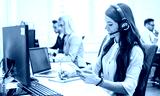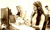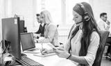 Friendly customer support female operator with headphones writing notes to notebook taken from smartphone at office
