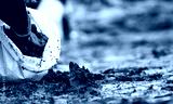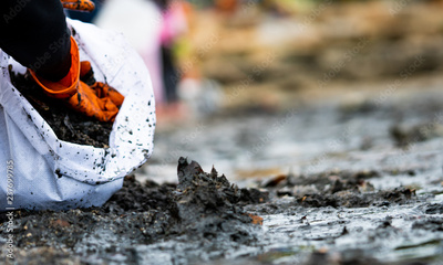Volunteers collecting garbage. Beach environment pollution. Volunteers cleaning the beach on blurred background. Tidying up rubbish on beach. Oil stains on the beach. Oil leak to the sea.