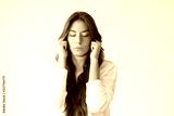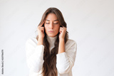 Attractive tired girl touching painful temples. Portrait of young Hispanic woman with closed eyes having headache. Isolated on white. Relaxing concept