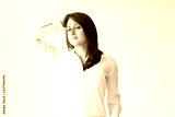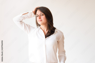 Beautiful young woman thinking and touching head. Thoughtful student in white blouse. Isolated on white. Thinking concept