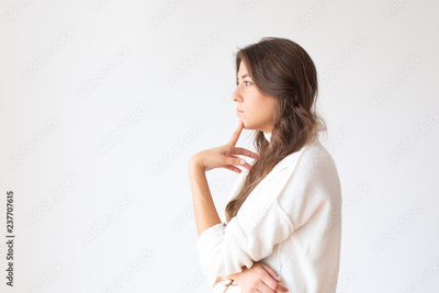 Pensive Hispanic girl touching chin with finger, side view. Profile portrait of Latin thoughtful young woman. Isolated on white. Thinking concept