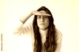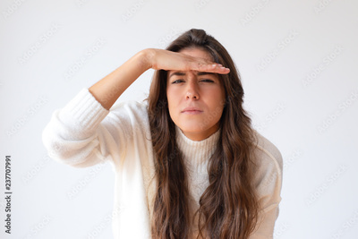 Thoughtful Hispanic girl holding hand near forehead looking away for startup. Beautiful brunette young woman looking for new idea. Isolated on white. Thinking concept