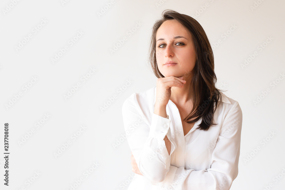 Thoughtful young manager holding fist under chin and looking at camera. Pensive female student in white blouse. Isolated on white. Thinking concept