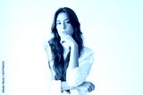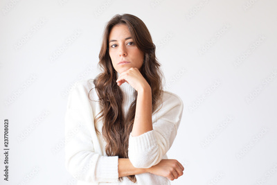 Thoughtful Latin woman holding chin and looking at camera. Beautiful pensive Hispanic girl in white sweater. Isolated on white. Thinking concept