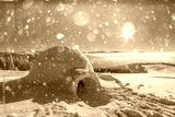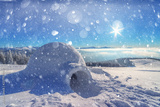 Real snow igloo house in the winter Carpathian mountains. Snow-covered firs on the background. Christmas holiday postcard collage. DOF bokeh light postprocessing effect