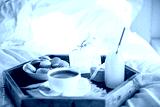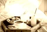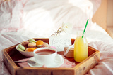 Breakfast in bed with i love you text on a note. Cup of coffee, juice, macaroons, rose flower and giftbox on wooden tray. Romantic breakfast in bed. Birthday, Valentine's day morning. Copy space.