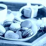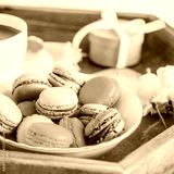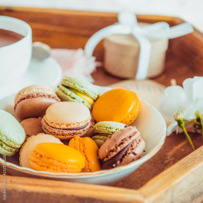 Sweet breakfast in bed for lover. Close up macaroons, cup of coffee, flower and gift box on wooden tray. Romantic breakfast in bed. Birthday, Valentine's day morning. Square card. Selective focus.
