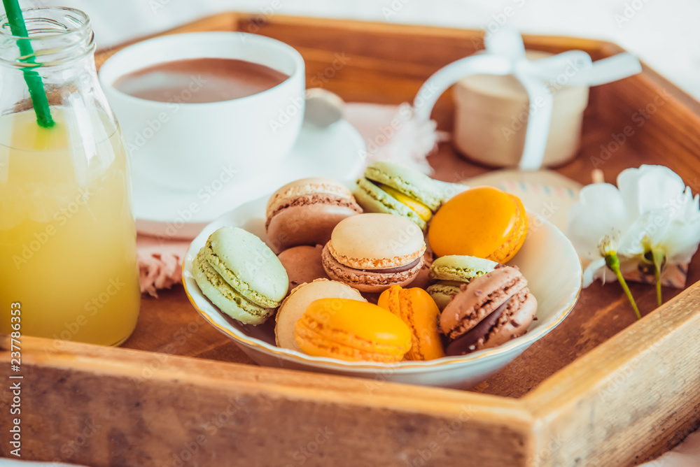 Sweet breakfast in bed for lover. Close up macaroons, cup of coffee, juice, flower and gift box on wooden tray. Romantic breakfast in bed. Birthday, Valentine's day morning. Selective focus.