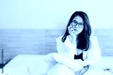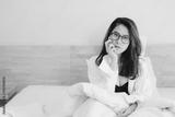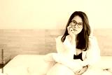 Portrait of Asian sexy woman wearing white shirt, sitting on the bed and looking to the camera.