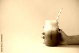 Woman hand holding glass jar of green smoothie, fresh juice against yellow background. Healthy beverage, vegan, vegetarian concept. Banner with copy space