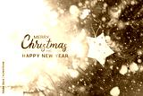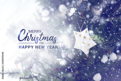 Merry Christmas and happy new year concept, Closeup of white star hanging from a decorated tree with bokeh, Xmas holiday background.
