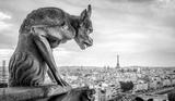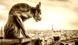 Gargoyle on Notre Dame de Paris cathedral looks at Eiffel Tower, France