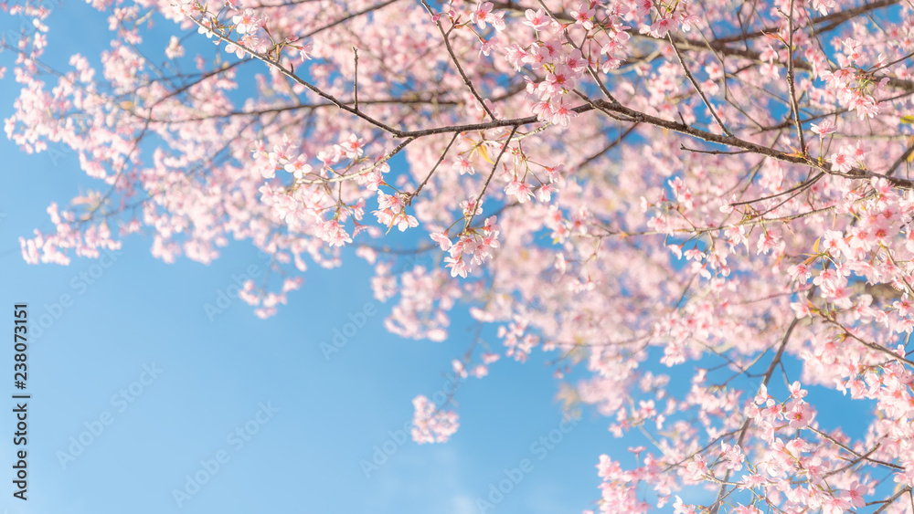 Beauty in nature of pink spring cherry blossom in full bloom under clear blue sky.