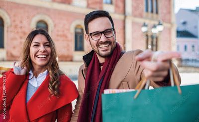 Happy couple in shopping. Consumerism, love, dating, lifestyle concept