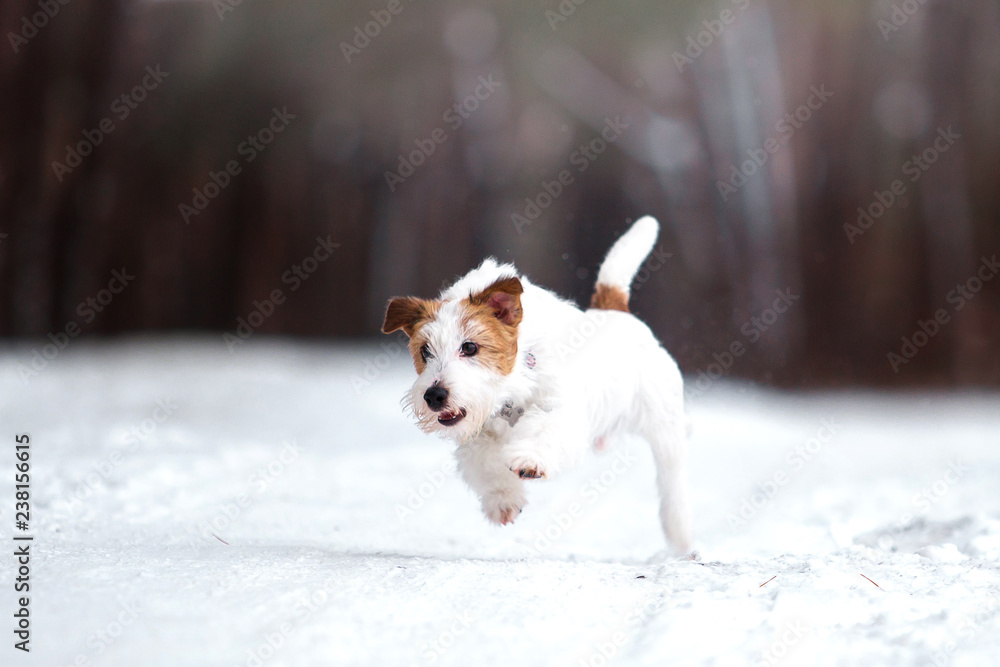 Beautiful puppy of breed Jack Russell Terrier in the winter forest