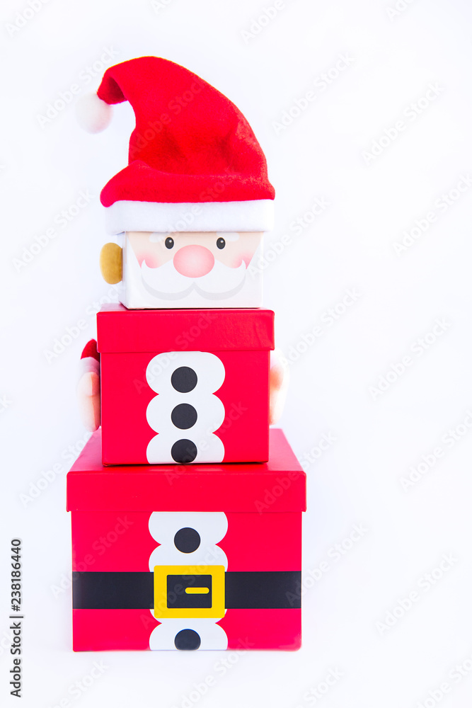 Christmas gift boxes tower in the shape of a Santa Clause on white background isolated. Xmas. family holiday concept. Merry Christmas and Happy Holidays. Vertical card. Selective focus. Copy space.