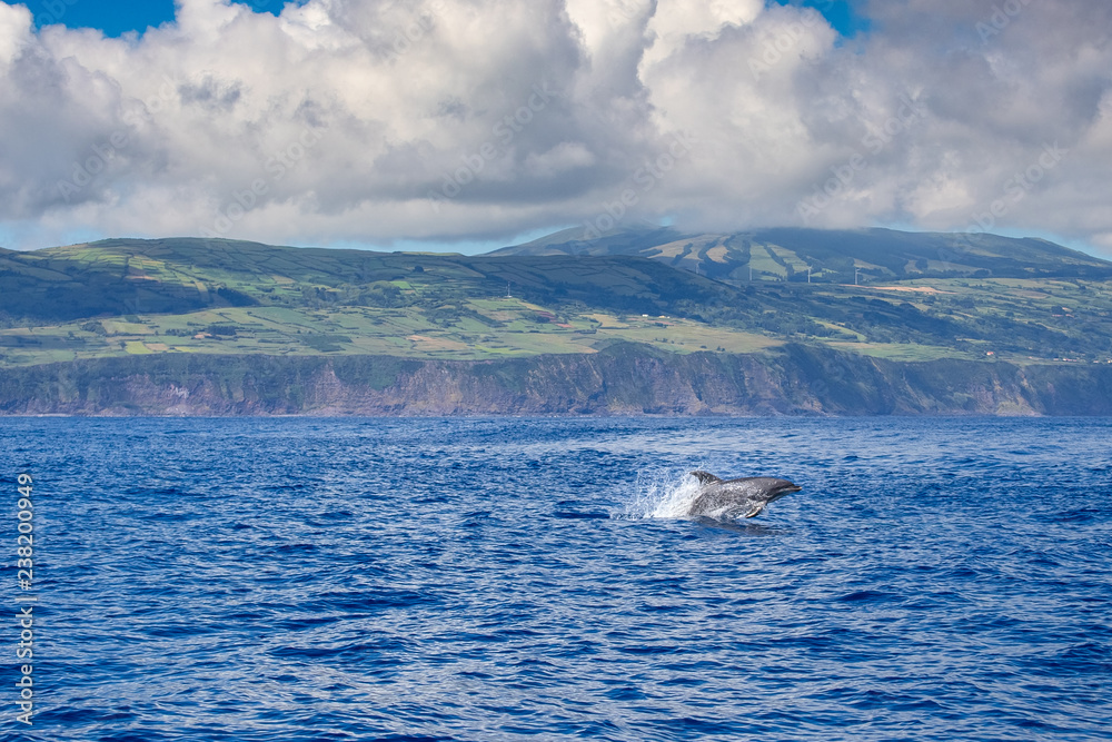 A jumping family of wild bottlenose dolphins, Tursiops truncatus, spotted during a whale watching trip in front of the coast between Pico and Faial, in the western Açores Islands.