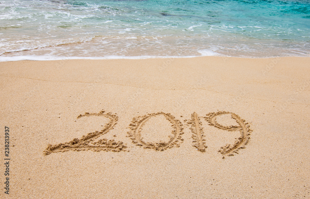 2019 written on white sandy beach of the Caribbean. Tropical New Year background