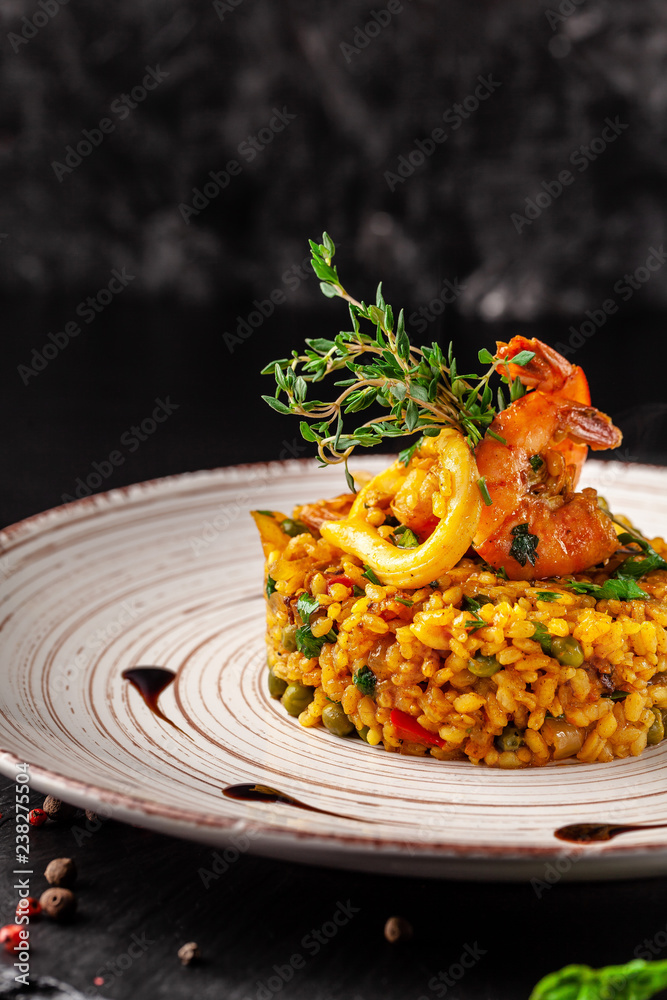 The concept of Spanish cuisine. Paella with seafood, shrimps, squid and greens. Beautiful serving in the restaurant.