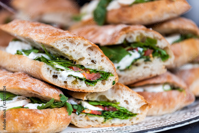 Closeup of fresh display of stacked pile of panini bread, mozzarella melted cheese, vegetarian italian tomatoes, basil lettuce in store, shop, cafe buffet catering sandwiches