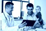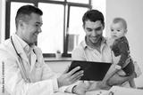 medicine, healthcare, pediatry and people concept - happy doctor showing tablet computer to father with baby daughter at medical office in hospital