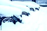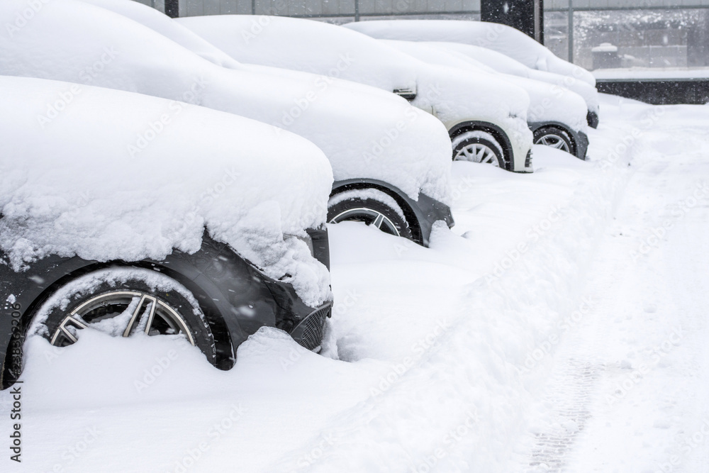 Number of cars parked littered with snow, view of the front wheel hood and bumper.