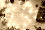 Christmas, New Year frame with festive lights on the wooden background. Winter holiday celebration top view card. Copy space