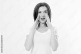 Caucasian young woman shouting hot news. gossip girl isolated on white background. Summer t shirt template blank. Copy space