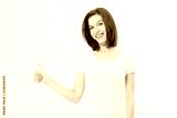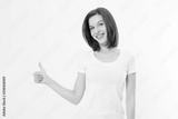 Young caucasian woman in template blank t shirt showing big thumb up isolated on white background. Happy and success concept. Copy space