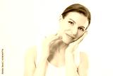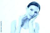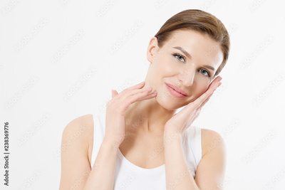 Young beautiful woman touching clean fresh face skin . Anti aging concept. Facial treatment . Cosmetology , Beauty and spa. Isolated on white