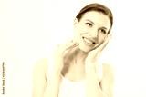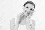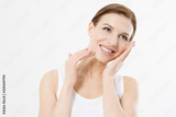 Young beautiful woman touching clean fresh face skin . Anti aging concept. Facial treatment . Cosmetology , Beauty and spa. Isolated on white