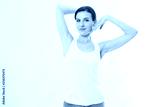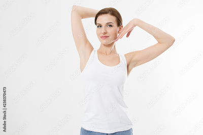 Blank template t shirt. Beauty Woman with perfect skin armpits and epilation isolated on white background. Laser hair removal. Brunette girl holding arms up and showing clean underarms. Copy space