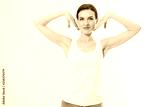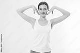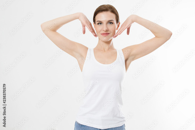 Blank template t shirt. Beauty Woman with perfect skin armpits and epilation isolated on white background. Laser hair removal. Brunette girl holding arms up and showing clean underarms. Copy space