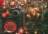 Christmas dinner table with whole roasted turkey, stuffed with dried fruits served in roasting pan with sauce,red plates, cutlery, decoration and burning candles, top view. Traditional Christmas food