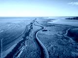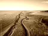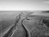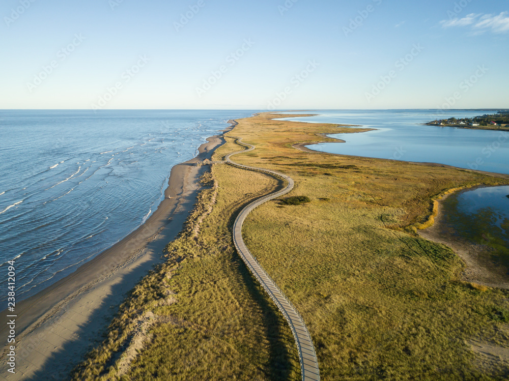 Aerial view of a beautiful sandy beach on the Atlantic Ocean Coast. Taken in La Dune de Bouctouche, New Brunswick, Canada.