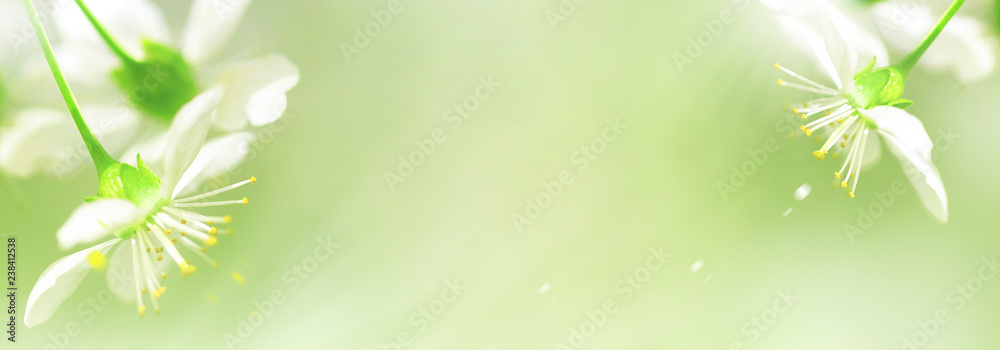 Natural spring background. White cherry flowers on a delicate green background. Free copy space. Artistic spring summer image. Banner design.