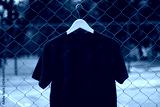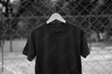 Black short sleeve t shirt on wood hanger in outdoor. Ready for your mock up design or presentation your design project.