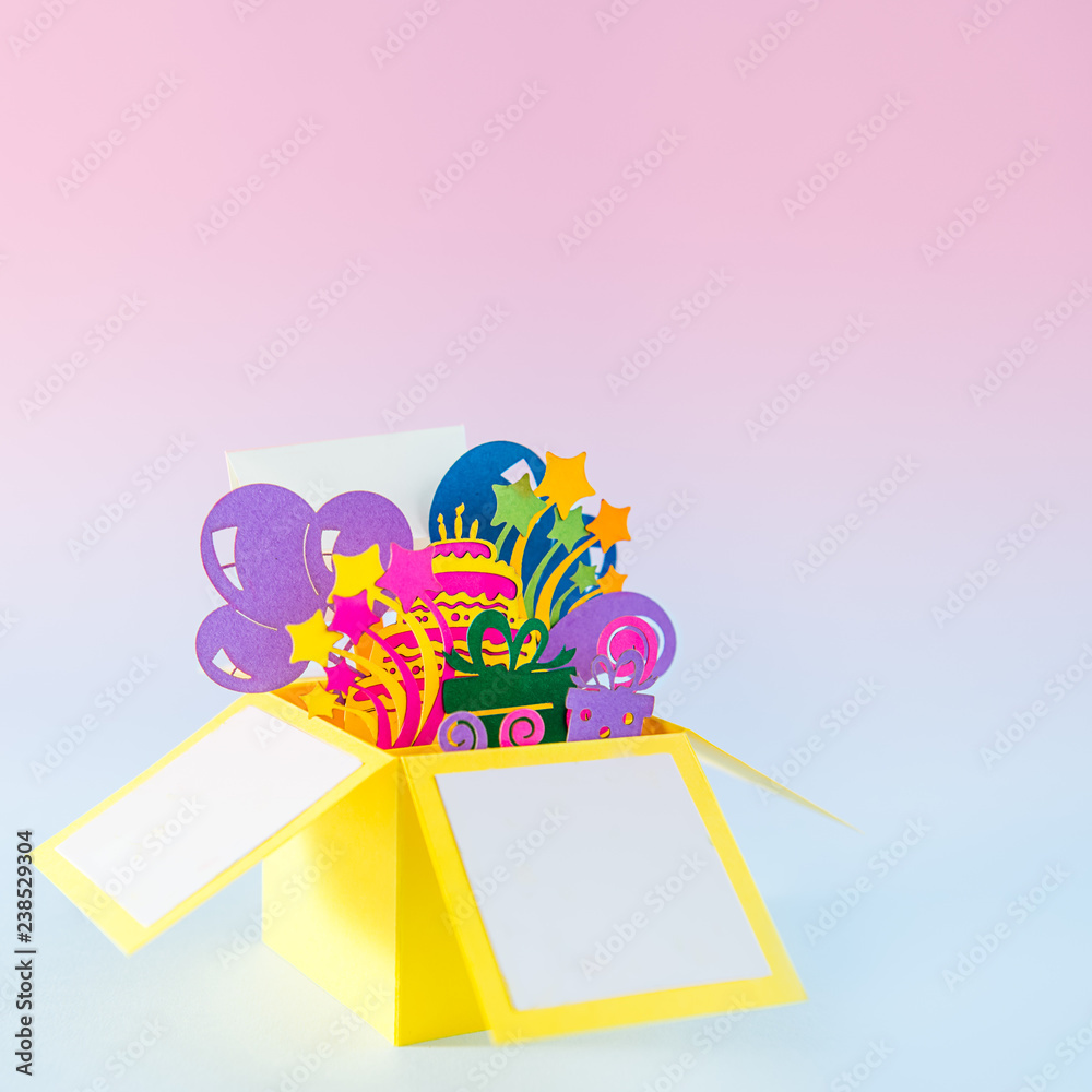 Happy birthday handcraft pop -up greeting card made of paper. Bright postcard with 3D paper figure of giftbox with birthday cake, presents, balloons, fireworks inside. Gradient background. Copy space.