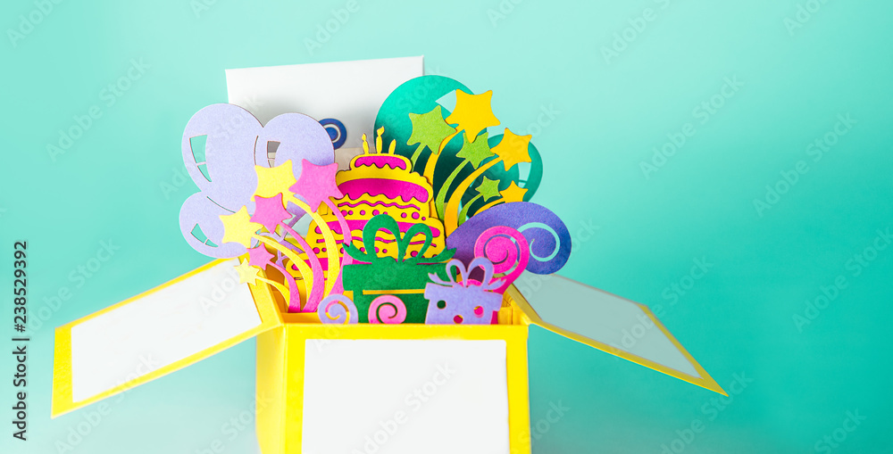Happy birthday handcraft pop -up greeting card made of paper. Bright postcard with 3D paper figure of giftbox with birthday cake, presents, balloons and fireworks inside. Wide banner. Copy space.