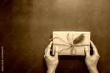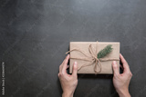 Christmas gift box with note card and tree branch decor on marble background. Flat lay, Top view with copy space