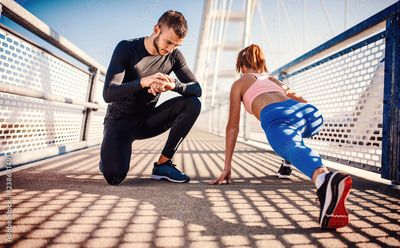 Jogging. Young couple enjoys together in the morning training outdoor. Sport, fitness, recreation concept