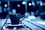 A ceramic cup of coffee on the wood plank table with beautiful light bokeh in the background.