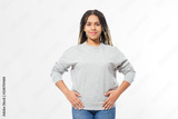 African american girl in template blank sweatshirt isolated on white background. Front pullover view. Copy space and mock up. Place for adverising